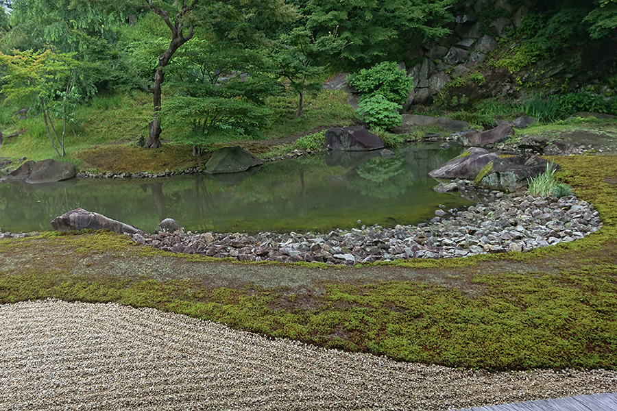 Japanese dry garden is composed by sand, rock, grass and tree.
